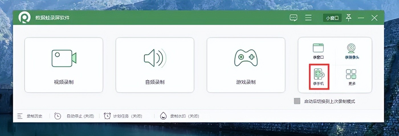 步骤1:打开数据蛙录屏软件,选择合适的录屏模式(窗口录制、手机录制、摄像头录制等),我们选择“手机录制”功能。