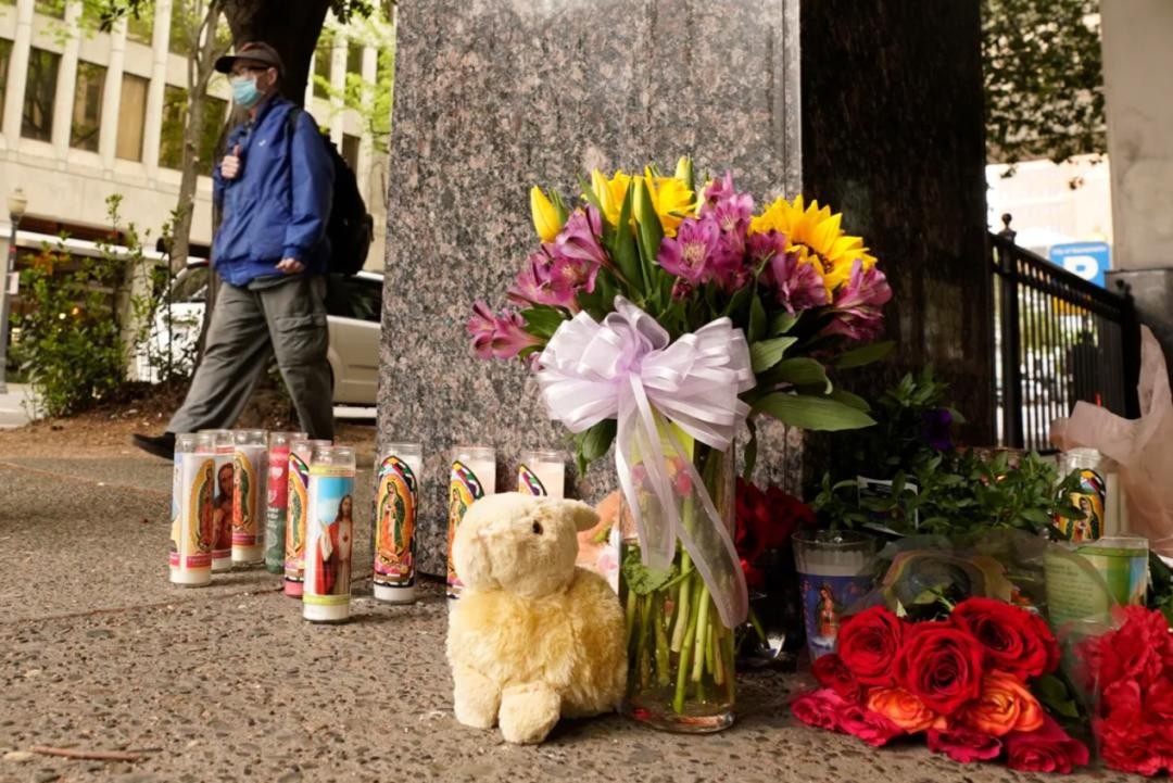 在案发现场的人行道上,堆满了蜡烛、气球和鲜花等纪念品。