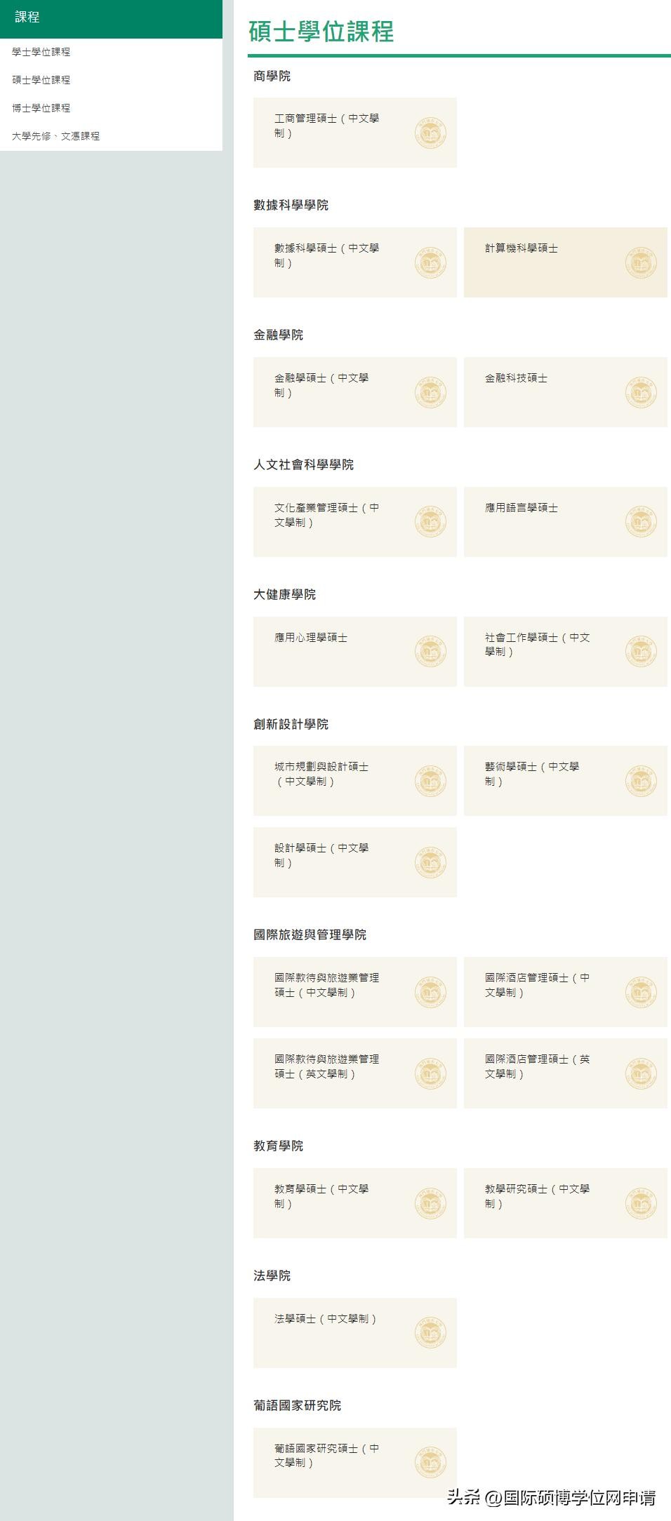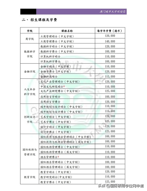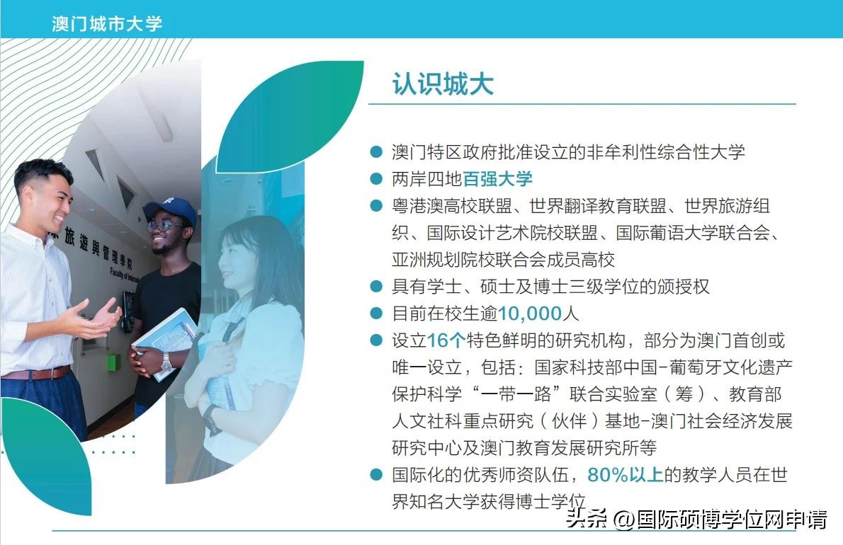 澳门城市大学设有9个学院,包含商学院 、数据科学学院 、金融学院 、人文社会科学学院 、创新设计学院 、国际旅游与管理学院 、教育学院 、法学院 、葡语国家研究院。澳城大2年学制硕士全日制适合双非二本、自考本、专升本、成人本的学生申请。