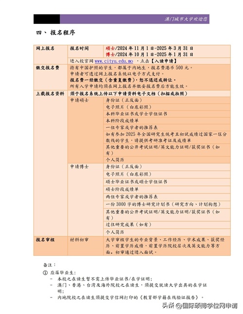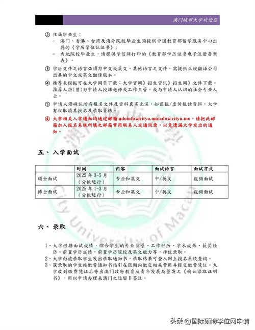 往届生申请需要提供2025年考研成绩且过A区线(工商管理硕士除外)。澳城大从去年开始就没有强制语言成绩的要求,有四六级/雅思的可以作为加分材料提交。申请可以先提交,考研成绩出分后申报。硕士申请需要1封以上推荐信/博士需要2封,用澳城的推荐信模版填写完整后推荐人签名,上传系统。应届生申请需要提交《教育部学籍在线验证报告》,往届生申请需要提交的《教育部学历证书电子注册备案表》。博士面试将在1-3月进行,硕士面试将在3-5月进行。