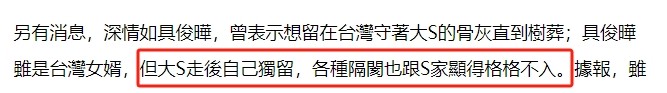 最终是大S妥协,把一处价值两亿的房产转移给了她。而这也注定是具俊晔的心病,台媒爆料称,大S去世之后,他已经与S家产生隔阂。