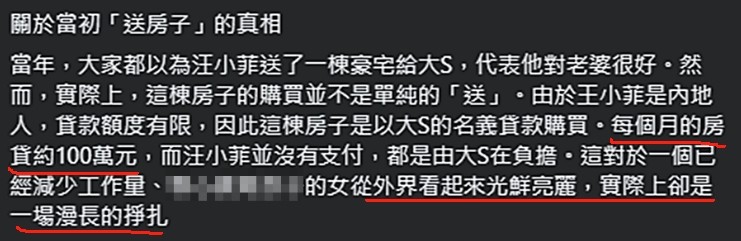 当初购买的时候,因为汪小菲的北京户籍在台湾地区的额度有限,因此只能用大S的名义贷款。而这就是问题所在,因为大S已经减少工作,虽然外表依然是光鲜亮丽,可实际上每个月100万的贷款,对她来说是一场漫长的挣扎。
