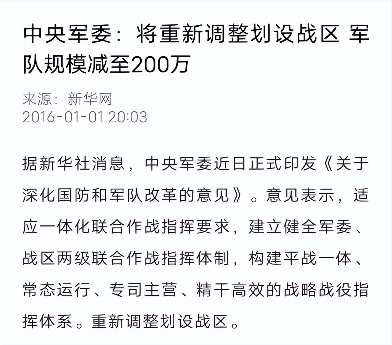 2,2016.1.1-新华网-中央军委:将重新调整划设战区 军队规模减至200万
