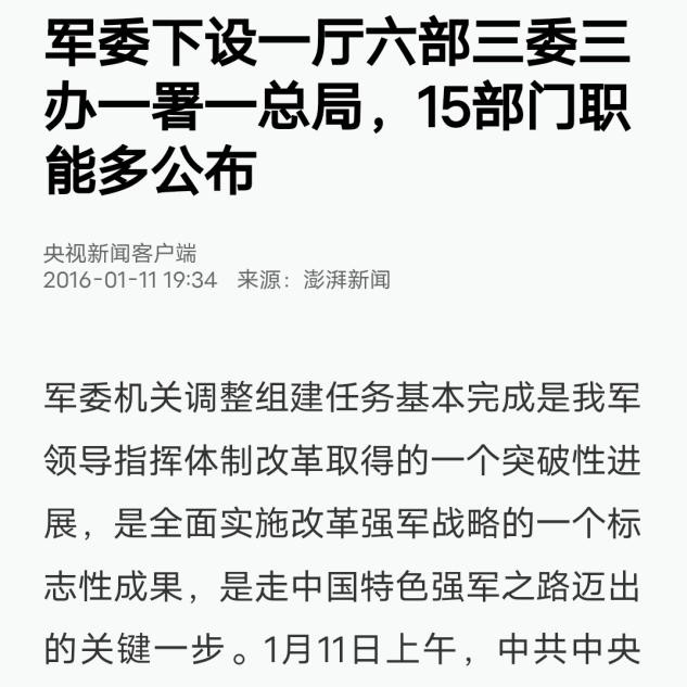 1,2016.1.11-澎湃新闻-军委下设一厅六部三委三办一署一总局,15部门职能多公布