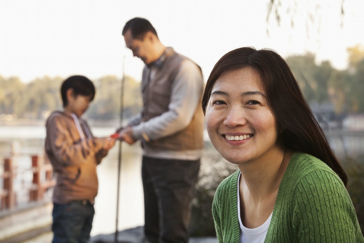 一家人享受钓鱼的时光