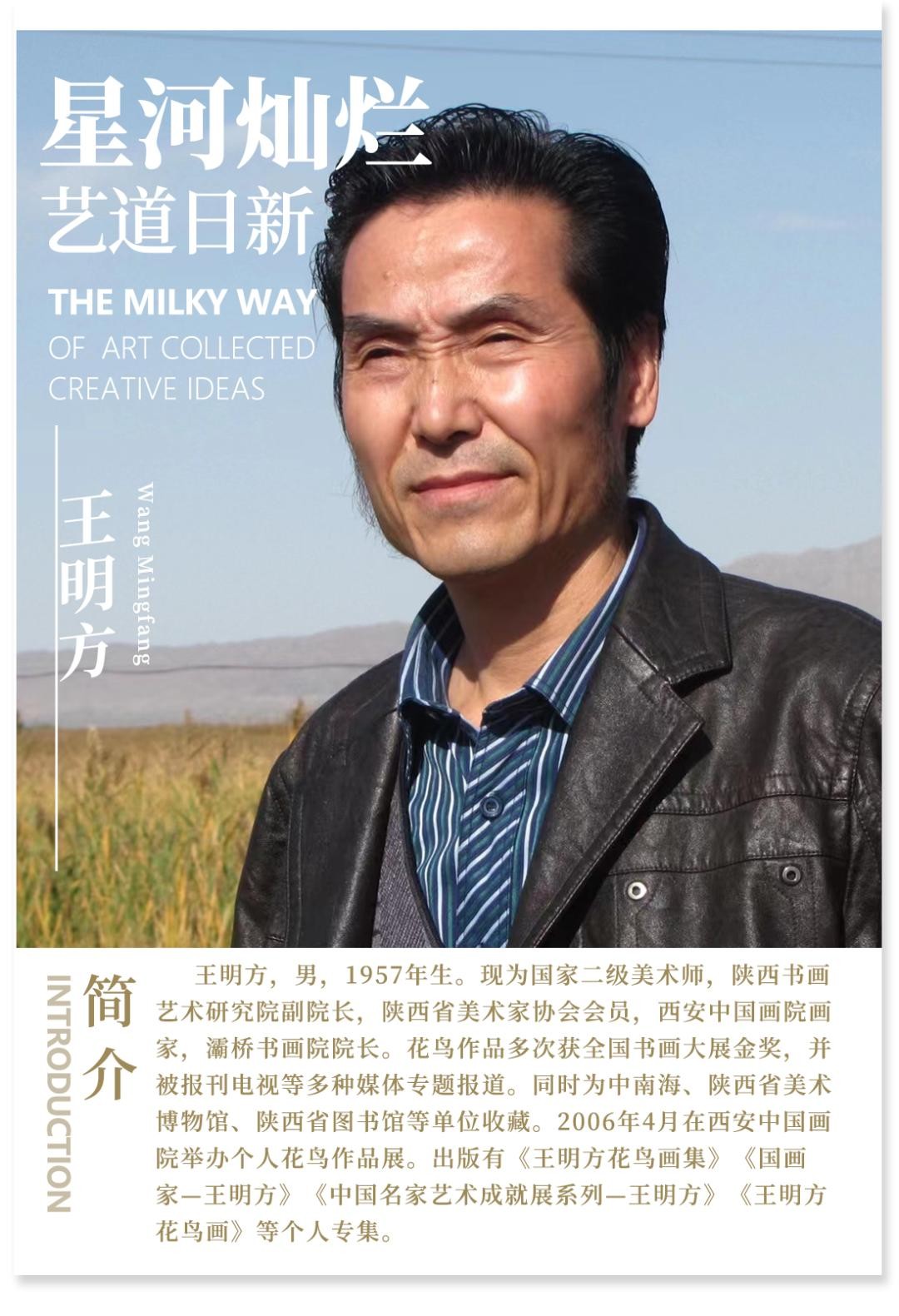 王明方,男,1957年生。现为国家二级美术师,陕西书画艺术研究院副院长,陕西省美术家协会会员,西安中国画院画家,灞桥书画院院长。花鸟作品多次获全国书画大展金奖,并被报刊电视等多种媒体专题报道。同时为中南海、陕西省美术博物馆、陕西省图书馆等单位收藏。2006年4月在西安中国画院举办个人花鸟作品展。出版有《王明方花鸟画集》《国画家—王明方》《中国名家艺术成就展系列—王明方》《王明方花鸟画》等个人专集。