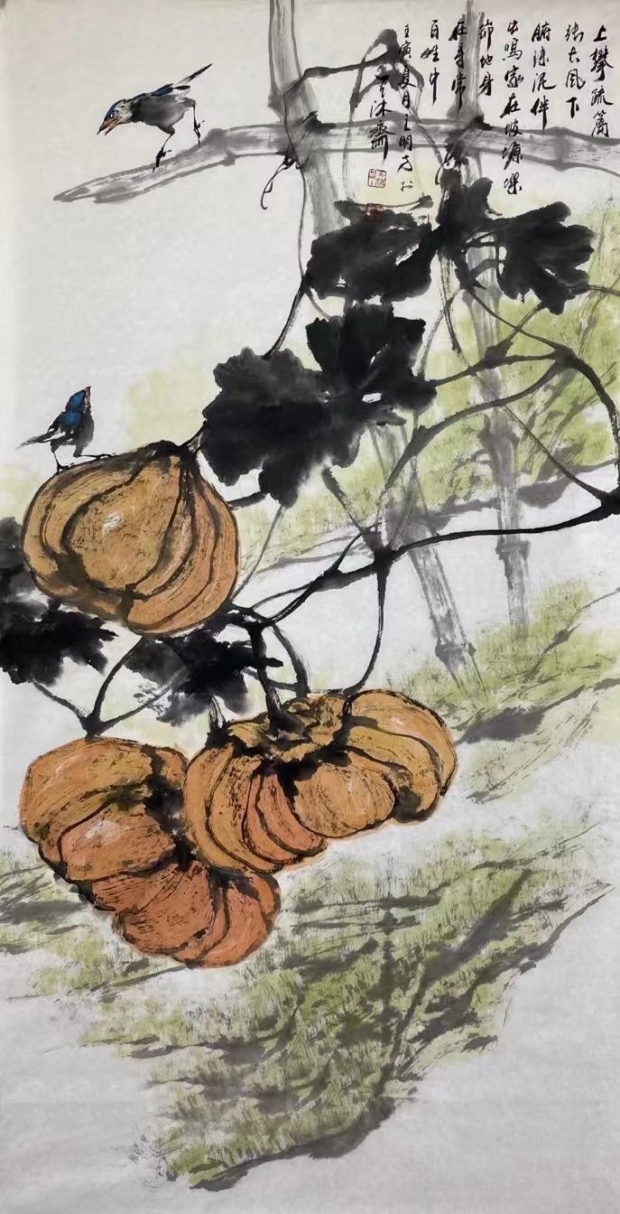 明方先生出生于农村,从小受到大自然的熏染。他热爱故土,热爱乡间的一草一木,一鸟一虫。从大田里的高梁玉米、棉花大豆,到果园草棚的南瓜葫芦、葡萄丝瓜。无不让他痴迷留恋。至于故乡常见的禽鸟虫鱼、野草闲花更是他每天勾描默写,深入研磨的必修课。有了这种深入骨髓的炽爱,才有了他笔精墨妙极具生命灵气的花鸟画。