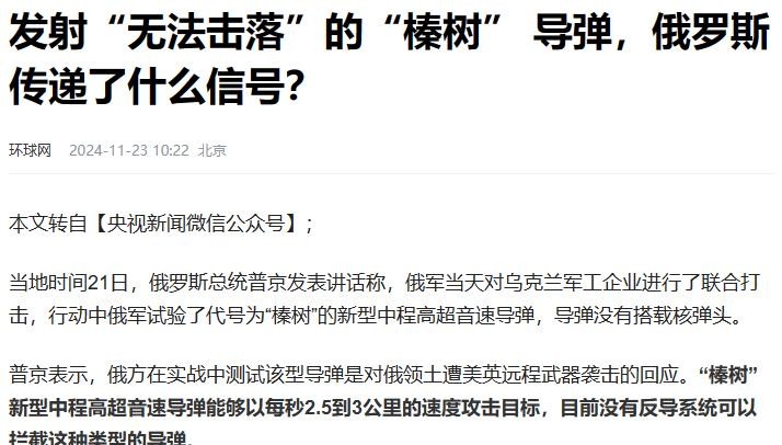 发射“无法击落”的“榛树” 导弹,俄罗斯传递了什么信号?--环球网---2024-11-23