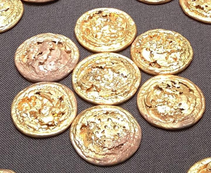 6。最后为了收藏方便,金饼还会被人工锤薄。锤打的方式是把金饼翻过来用锤子敲底部,于是就会产生了金饼顶部外侧有一个相对平整的外圈,而底部中间因为锤打的作用产生一个被压平的面的效果。