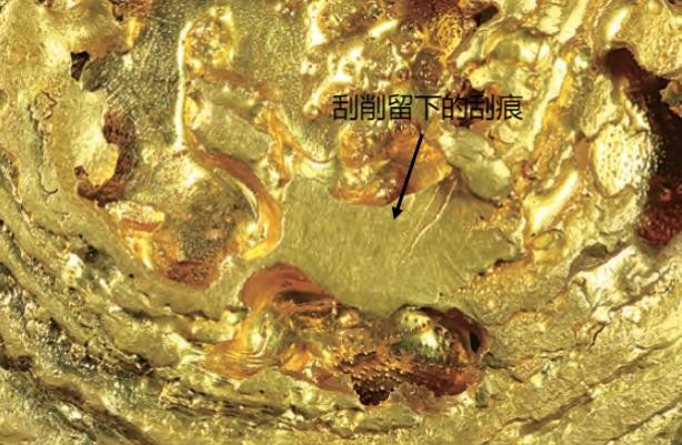 同时出土的所有金饼几乎都有加入嵌入物及刮削痕迹。目前已发现嵌入物37处,嵌入物主要为不规则的小金块,这是金饼铸造完成之后调整重量的标志。