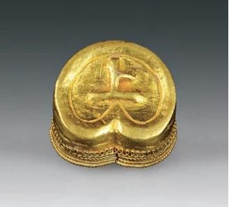 还有标志如“上”“中”“下”“上二”“上三”“中甲”“下三”等,已发现 40余处刻划痕。这些刻痕可能标志着金饼经过反复熔炼的工序编号。