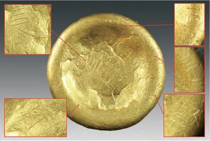 同时在出土的金饼上,我们能看到上面有多重刻画的标记: