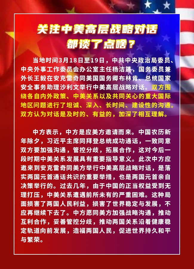 当地时间18日,中共中央政治局委员、中央外事工作委员会办公室主任杨洁篪、国务委员兼外长王毅在安克雷奇同美国国务卿布林肯、总统国家安全事务助理沙利文举行中美高层战略对话。
