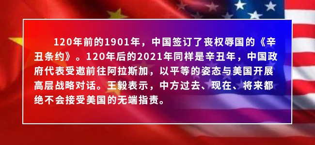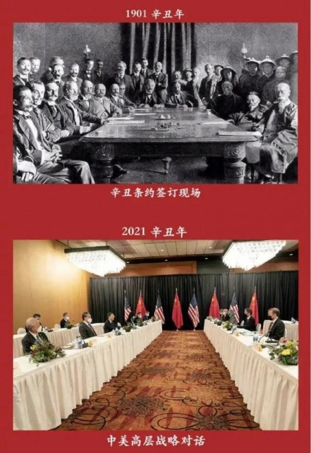 ——在中美对话之际,朋友圈内流传着两张辛丑年的照片,一张拍摄于1901年,另一张是2021年,前者是历史上辛丑条约签订现场,后者是中美高层战略对话现场。