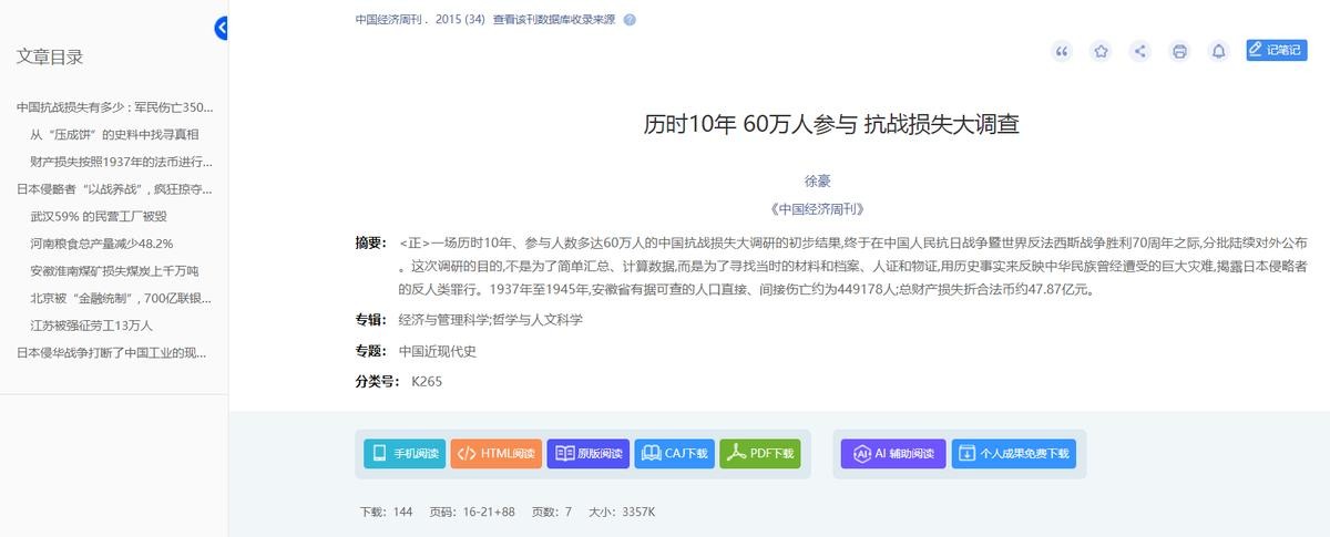 徐豪.历时10年60万人参与抗战损失大调查[J].中国经济周刊,2015,(34):16-21+88.