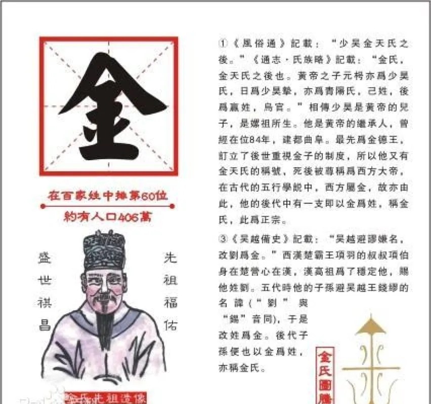 7、赐姓而来。班固《汉书》:“金日磾夷狄亡国,羁虏汉庭,而以笃敬寤主,忠信自著,勒功上将,传国后嗣,世名忠孝,七世内侍,何其盛也!本以休屠作金人为祭天主,故因赐姓金氏云。”西汉初匈奴休屠王太子金日磾(“日磾”读作“密滴”)降汉,因休屠人有以铜铸作金人(佛像)以祭天之习俗,汉武帝遂赐姓金氏,拜侍中,封秺侯。金氏一门侍汉室以忠诚孝节著称,七世为侍中。金与张、许、史四姓成为西汉初的四大贵族,其子孙成为河南京兆和安徽休宁的金氏望族;而居于甘肃陇西的休屠族也多以金为姓。明代蒙古王子也先土干,元人额森图克、阿尔哈特实哩等受赐金姓;清乾隆帝赐台湾土著七姓有金姓。