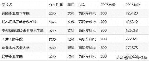 2023年全国大学在安徽省文理科中300分的大学有6所,均为专科批大学。