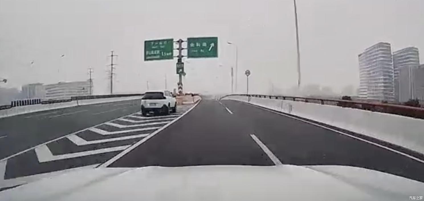 网传行车记录仪视频显示,一辆白色汽车突然从左侧超过搭载记录仪的车辆,并直接撞上道路下匝道分岔口的防撞水箱,迅速起火并翻滚下高架。事发地点位于上海市中环路到金科路的下道口。