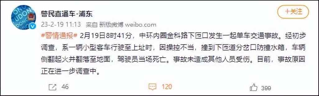 2月19日,上海中环发生一起单车交通事故,一小客车失控翻下高架并起火,司机当场身亡。