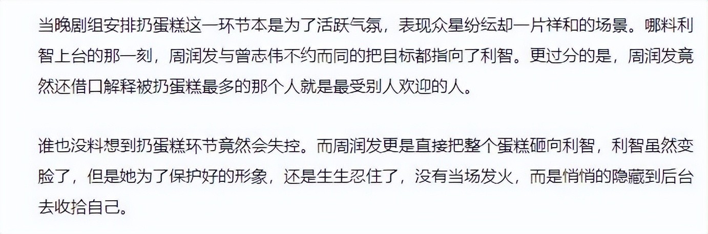 后来在“千粒星慈善演唱会”上,剧组安排了奶油蛋糕,让周润发和曾志伟,一起互掷来活跃气氛,原本一切照常进行,可当利智上台后就全变了。