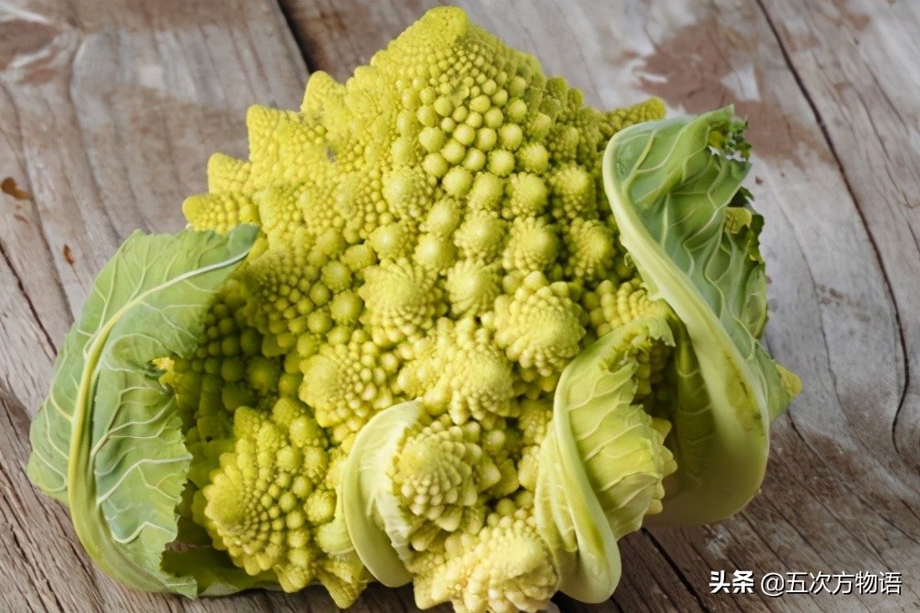 甘蓝的花用型,有花椰菜/var. botrytis、西蓝花/var. italica和罗马花椰菜等。花椰菜的食用部位是由总花梗、花梗和未发育的花芽密集而成的乳白色肉质头状体,也有橙、绿和紫等彩色型;西蓝花一般呈绿色,由已分化的花蕾组成。罗马花椰菜更是骨骼清奇,以一种特定的指数式螺旋结构生长,所有部位都是相似体,界面对密恐患者极不友好。