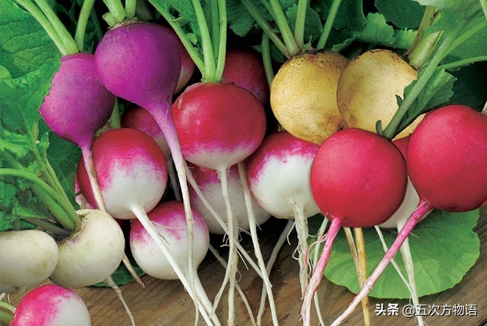 5、萝卜/R. sativus,有研究认为起源于中国北方,但有更多证据证明其原产地更可能是印度及地中海地区,进入中国很早,《诗经》中就有提及。栽培品种极多,在我国至少有1000余种,肉质根的大小形态、质地口感以及表皮颜色各有不同,吃法亦是丰富多彩,可生可熟,可盐可甜,可炒可煮,可腌可酱,不一而足。萝卜缨子也能吃,剁碎可作馅料。