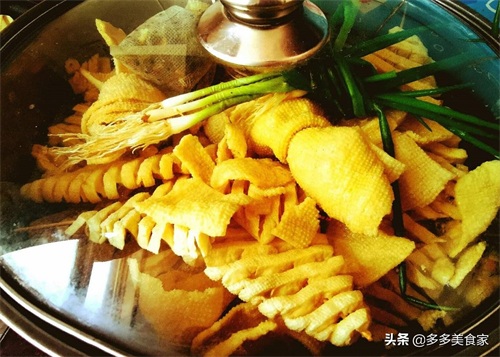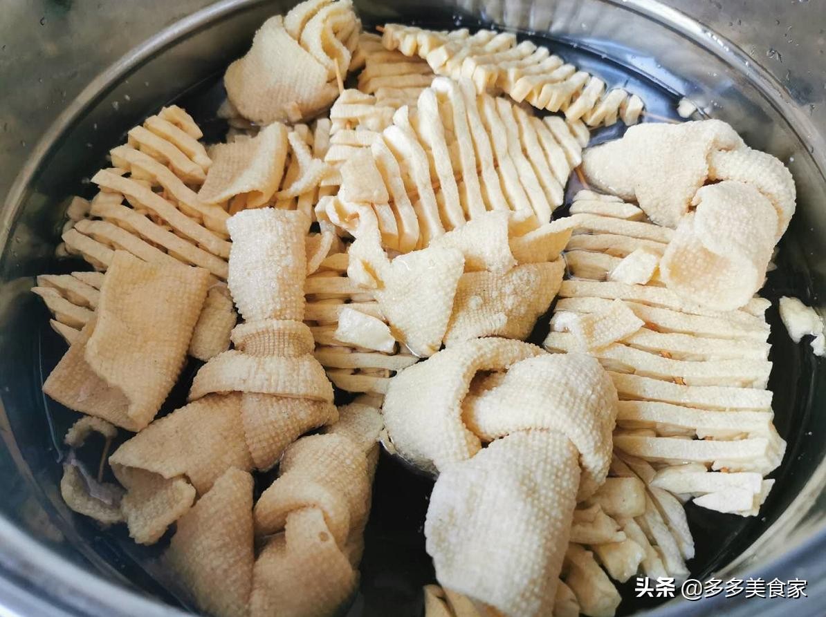步骤1、将豆腐串泡入温水中,时间大约为4个小时,这一步是为了让豆腐串彻底吸收水分,吃起来口感更好,而且大大缩短了焖煮时间!