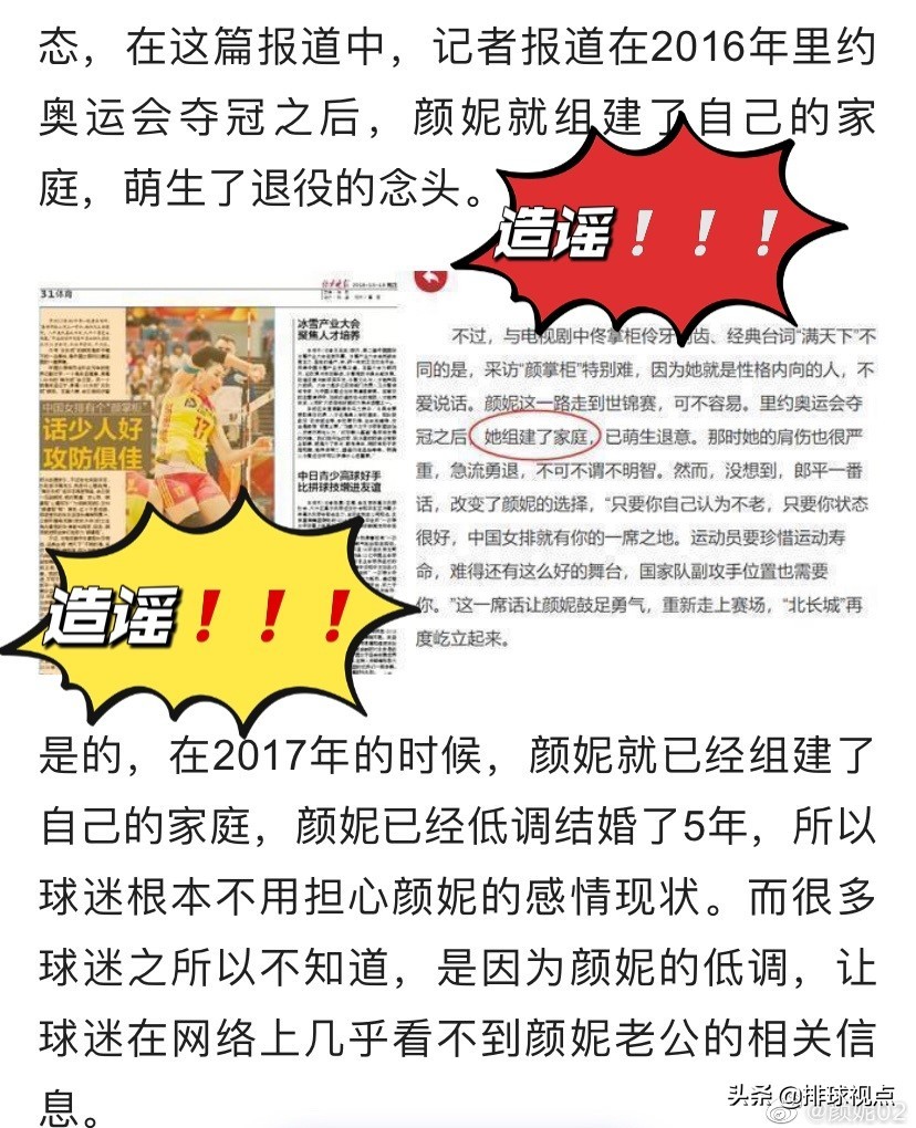 关于已婚的传闻,始作俑者就是北京纸媒记者孔宁,当年发布了一篇信口开河的新闻,里面提到颜妮时描述道:里约奥运会夺冠之后,她组建了家庭,已萌生退役。