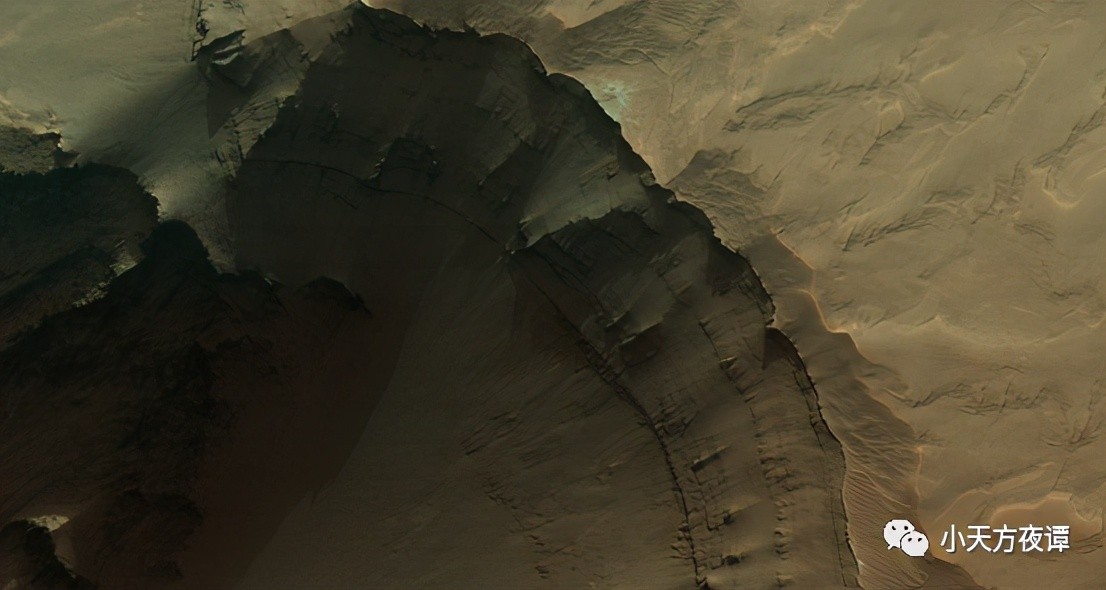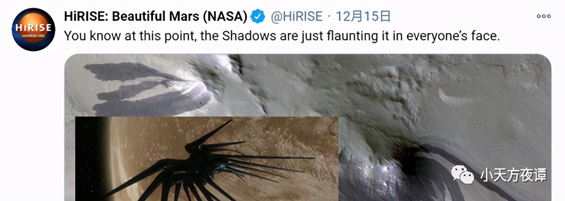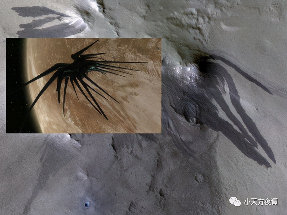 看起来是火星天上的飞行器的阴影,这个影子还挺漂亮,有点像天使的翅膀。HiRISE官方账号还将其与科幻剧《巴比伦五号》中的邪恶反派“影族(Shadows)”的飞行器对比。这一对比反而小天更慌了,在此小天只想代表众多群众问一句:“能打赢吗?”