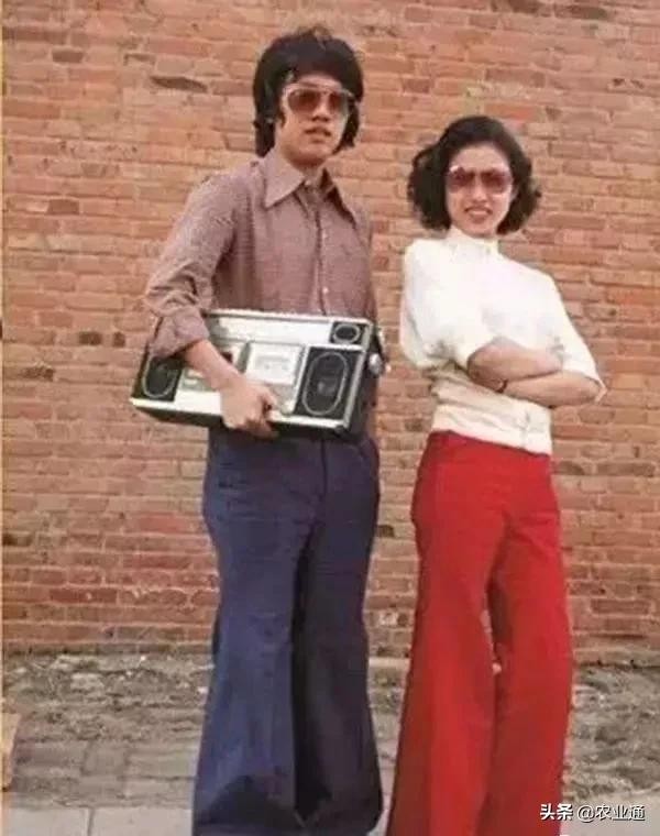 1980年代,北京,时尚小年青。穿着拖把一样的扫地喇叭裤, 戴着一副蛤蟆镜,身上再扛着一台收音机。
