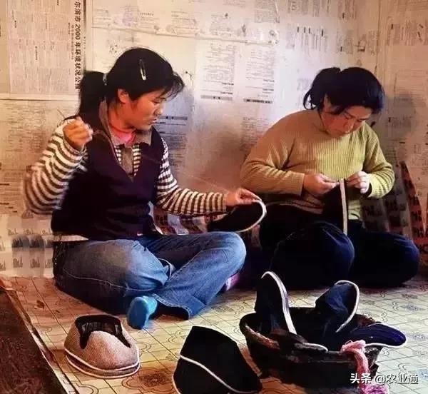 1980年代,东北农村,农村妇女做布鞋。
