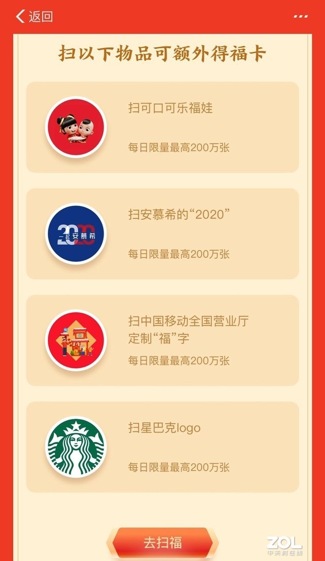 2020支付宝集五福活动的AR扫福玩法中,除了正常的扫福字的福卡,还可以扫可口可乐福娃、安慕希的“2020”、中国移动全国营业厅定制“福”字和星巴克logo获得额外福卡,大家知道这些额外福卡需要扫的图片是什么吗?