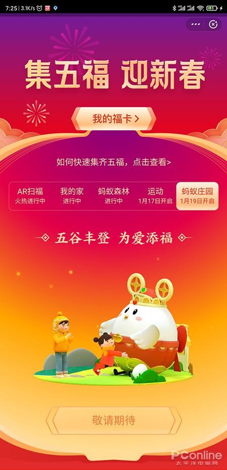 同样也没有开始,这个是蚂蚁庄园的新玩法,基本规则是给小鸡拜年,即有机会获得福卡,应该也是蛮让人期待的。
