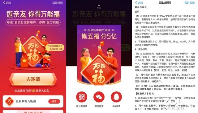 想要获得万能福卡,支付宝的入口有些不起眼,在主页进入集五福界面,点击我的福卡,然后再点击福卡榜,在顶部就会出现“邀亲友集福,你得万能福”的字样,点击去邀请,只要邀请一名新用户,必得一张万能福。这个界面也有机会在我的福卡界面左侧出现一直蓝色蚂蚁,点击也可进入。