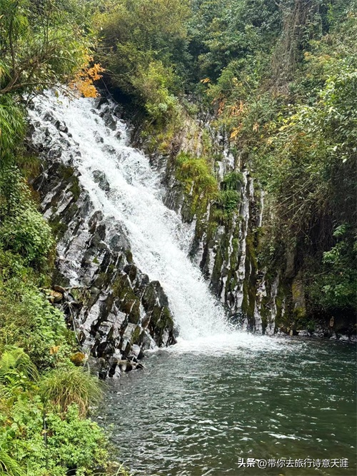 千千结瀑布,位于腾冲猴桥镇永兴村、高黎贡山山谷。瀑布挂在柱状节理形成的崖壁上。柱状节理壁是4万年前的火山遗址,火山喷发后留下的玄武岩六边形“石柱”,保存完整。