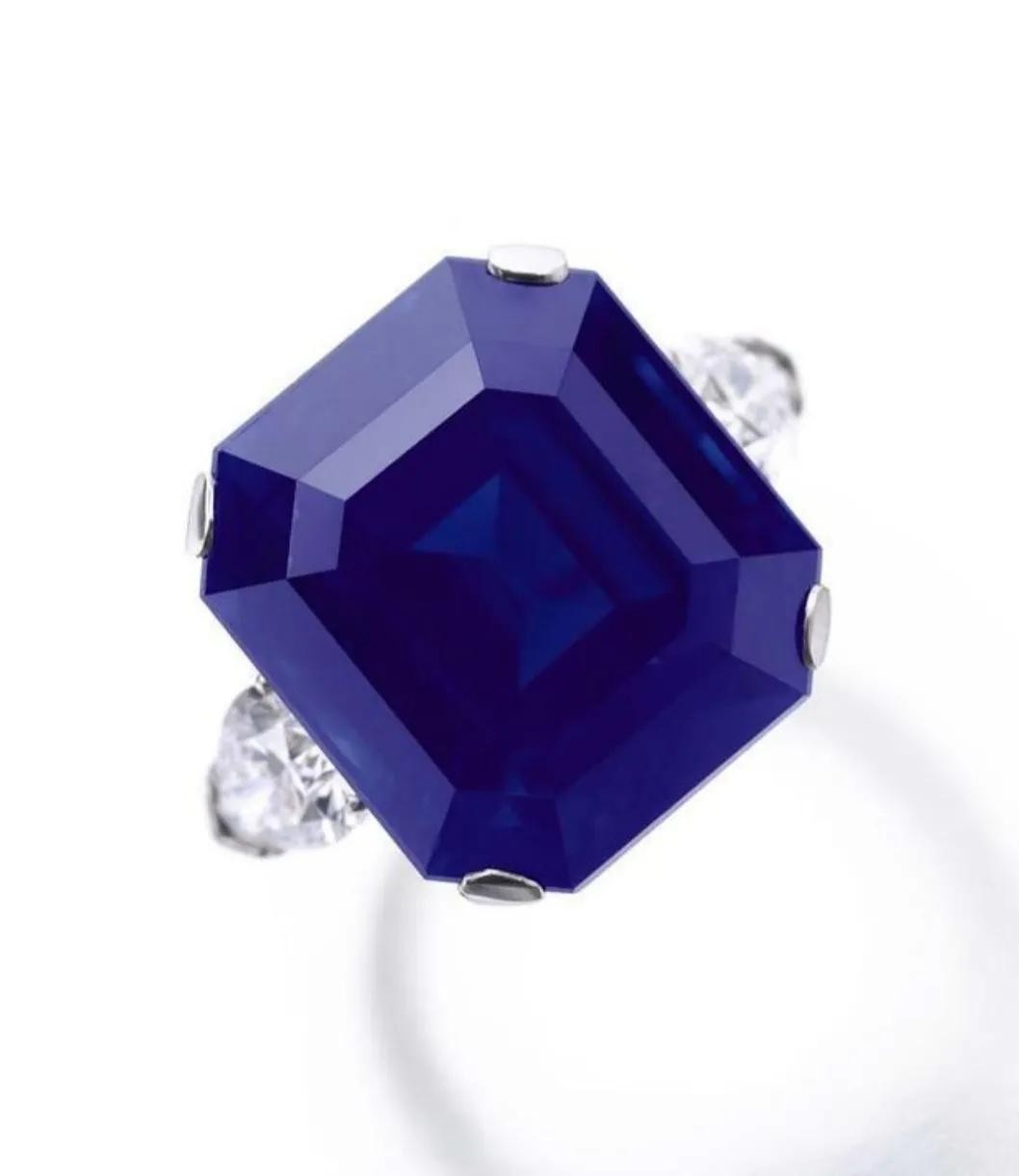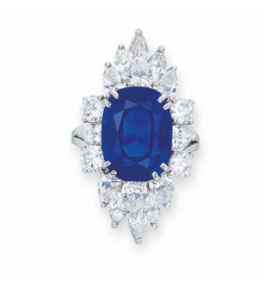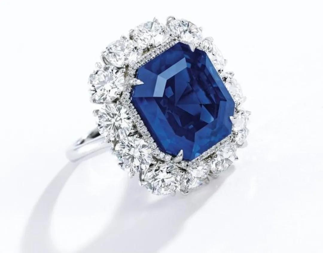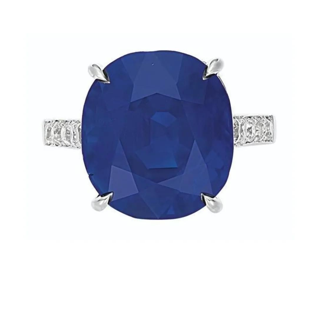 这款蓝宝石戒指主石为一颗16.72ct的枕形明亮切割蓝宝石,经 SSEF 和 AGL 鉴定产自克什米尔,未经过加热处理,其中 SSEF 鉴定其为皇家蓝(Royal Blue)蓝宝石,戒托由铂金制作,镶嵌圆形切割钻石。估价约169.5万美元。