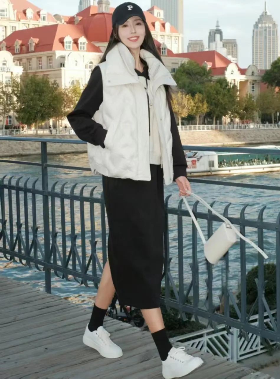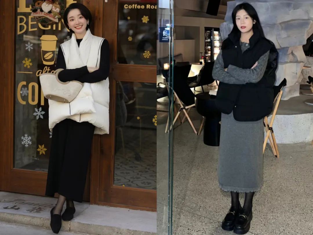 黑白搭配真不愧是经典配色,既显瘦又显高,而白色的羽绒马甲则为整体的穿搭增添了一抹亮色,也突出了女性的柔美和温柔。