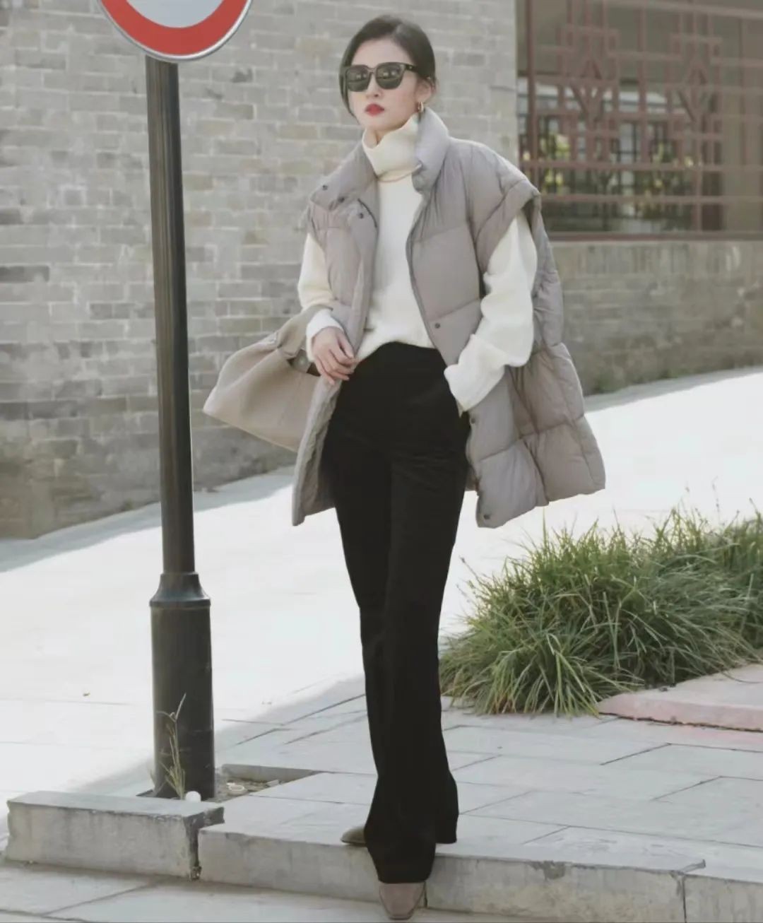 不如来看看上图的这位女士是如何搭配这一组合的吧,我们可以看到她用一件灰色的中长款羽绒马甲来搭配白色高领毛衣和黑色的灯芯绒材质的马蹄裤。