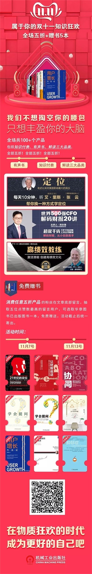 所以这次,我们用比以往更丰富的课程品类、比以往更全面的图书细分,当然也比以往更低的折扣,与你共度双十一的知识狂欢!