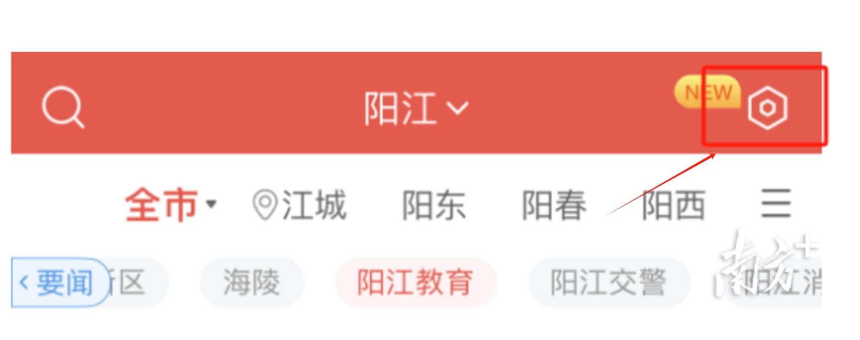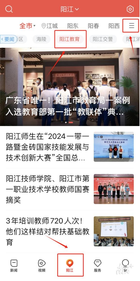 用户可在“南方+”客户端屏幕下方找到“定位”图标。进入“阳江频道”后选择“阳江教育”。
