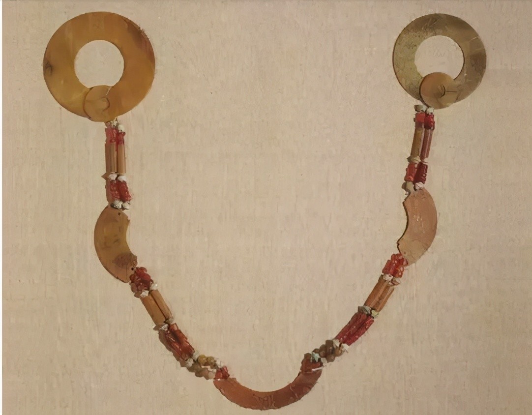 两端各为一环,环上放有玦,环下左右各有对称的两组串饰,均以绿松石珠、玉管、玛瑙珠构成。