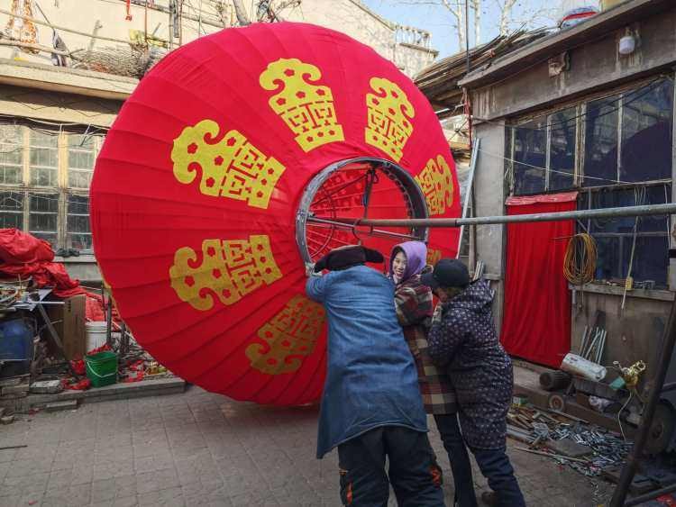 腊月二十三,白军平的家中仍是一片繁忙景象。靠近院门处,一个巨型宫灯骨架已经完成,工人正在将一圈圈线缠绕在宫灯骨架上。待宫灯骨架上缠满一圈圈线,白军平全家和工人们一起动手,先将撑开的宫灯收起,将绣着金字的红色绒布蒙在宫灯骨架上,然后全家人一起用力,将宫灯再撑起来,一个巨大的红色宫灯就制作完成。
