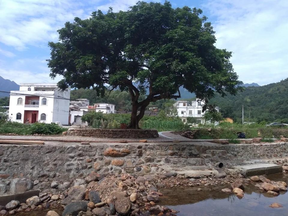 官成镇朝新村覃屋屯四面环山,屯内树林郁郁葱葱,小溪流经村庄,山清水秀。