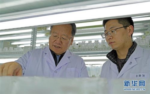 2019年1月23日,李天来(左)在沈阳农业大学指导学生观察作物育苗情况。新华社记者 杨青 摄