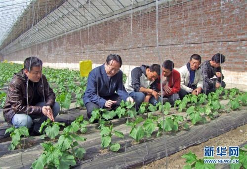 2011年3月26日,李天来(左二)在大棚里对农民进行技术指导。新华社发(沈阳农业大学供图)