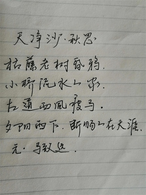 枯藤老树昏鸦,小桥流水人家,古道西风瘦马。夕阳西下,断肠人在天涯。