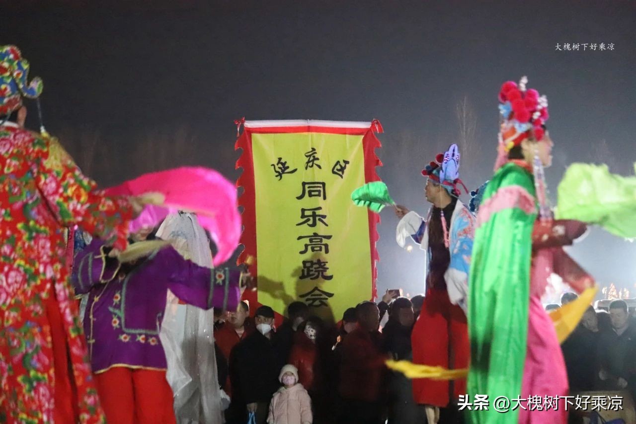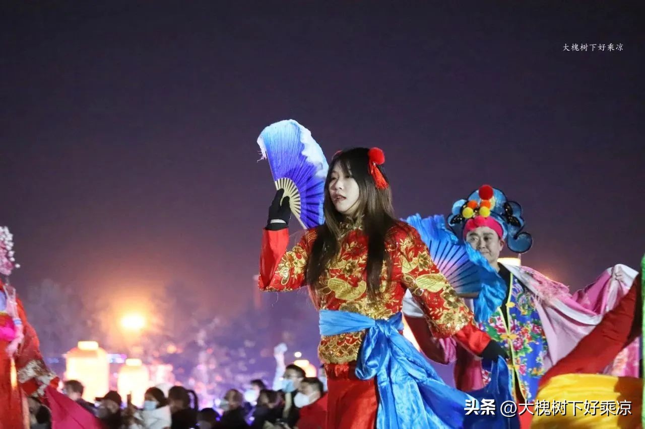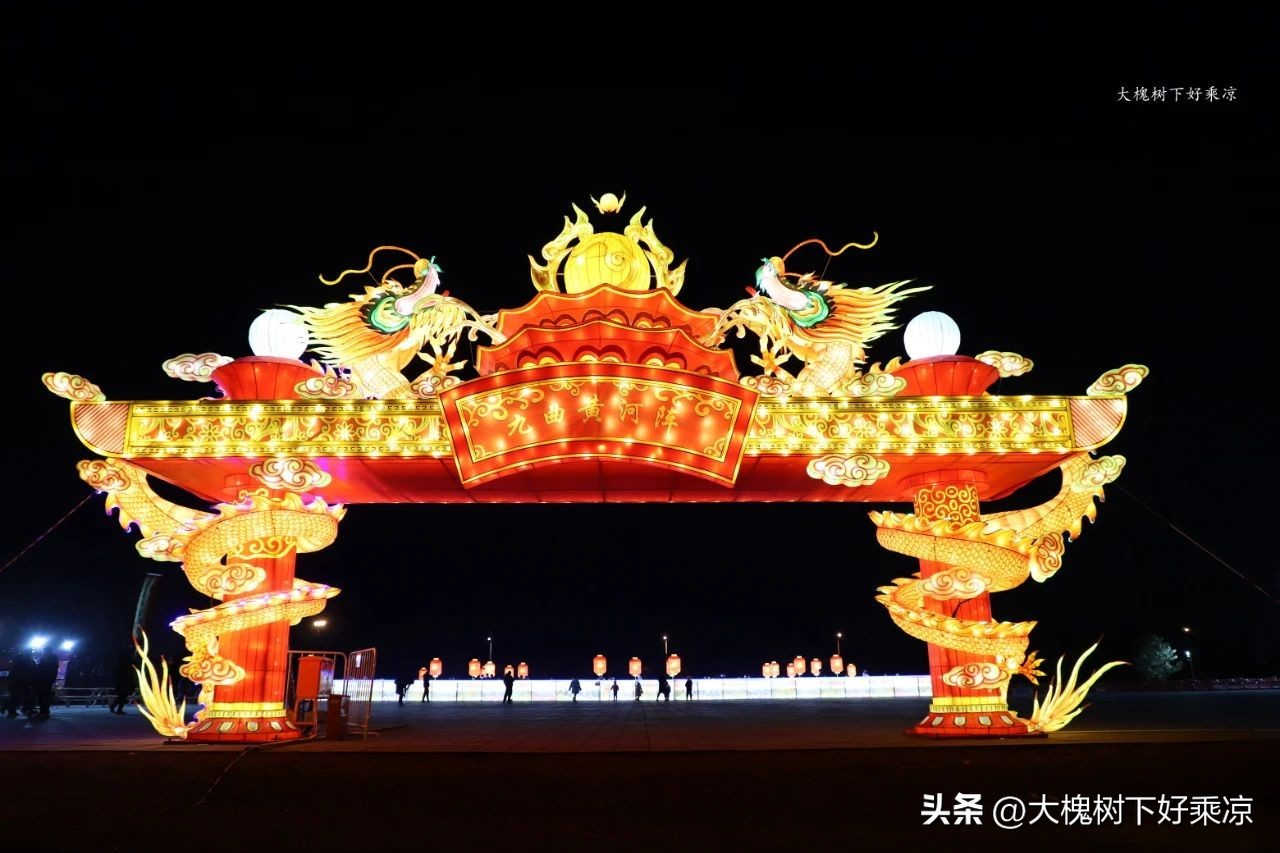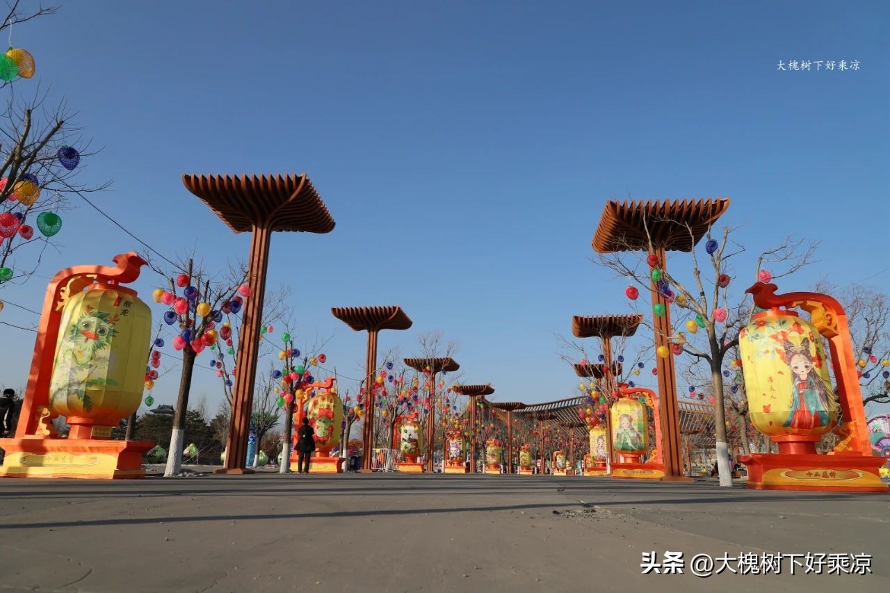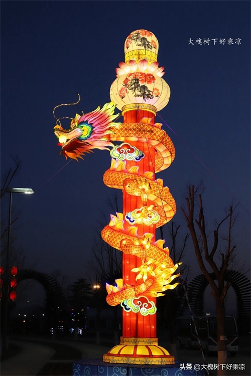 一处广场边矗立着一组花灯,叫九曲黄河阵,晚上在这里还有踩高跷表演。