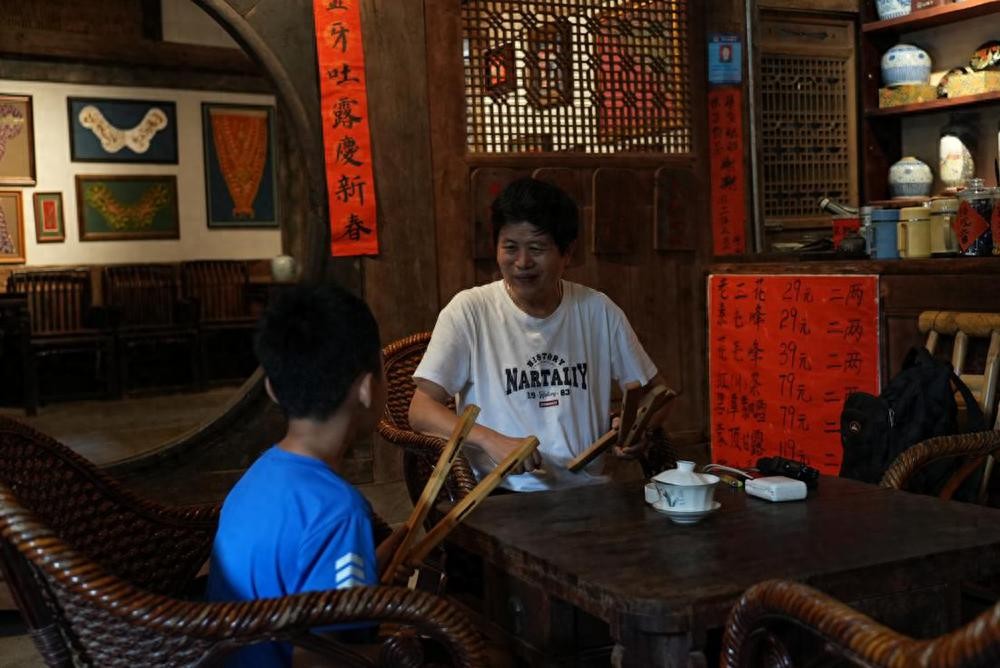 茶馆里的常客还有一个8岁的男孩,是店员正在读小学的儿子汪子博。平日放学后,茶馆是他的乐园。假期来了,他便跟着何宏泉学打金钱板。一副表演板与一副儿童板,一奏一跟,成了这个从小泡在茶馆里的孩子的独家记忆。