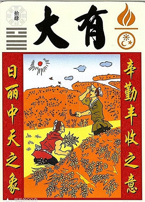 这一卦主要讲人丰收有了有了财富之后怎样处世为人对社会做贡献,这一卦上卦为离,下卦为乾,象征太阳当空照耀,大地五谷丰登,大获所有,也正好应对了前一卦的“同人卦”,众人同心同德,自然会大有收获。