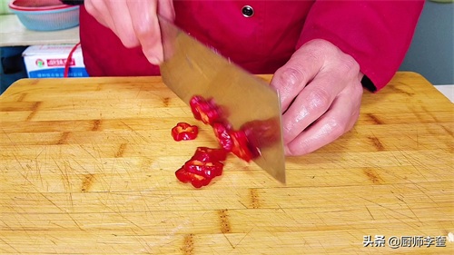 红椒顶刀切成辣椒圈,点缀一下菜品的颜色,